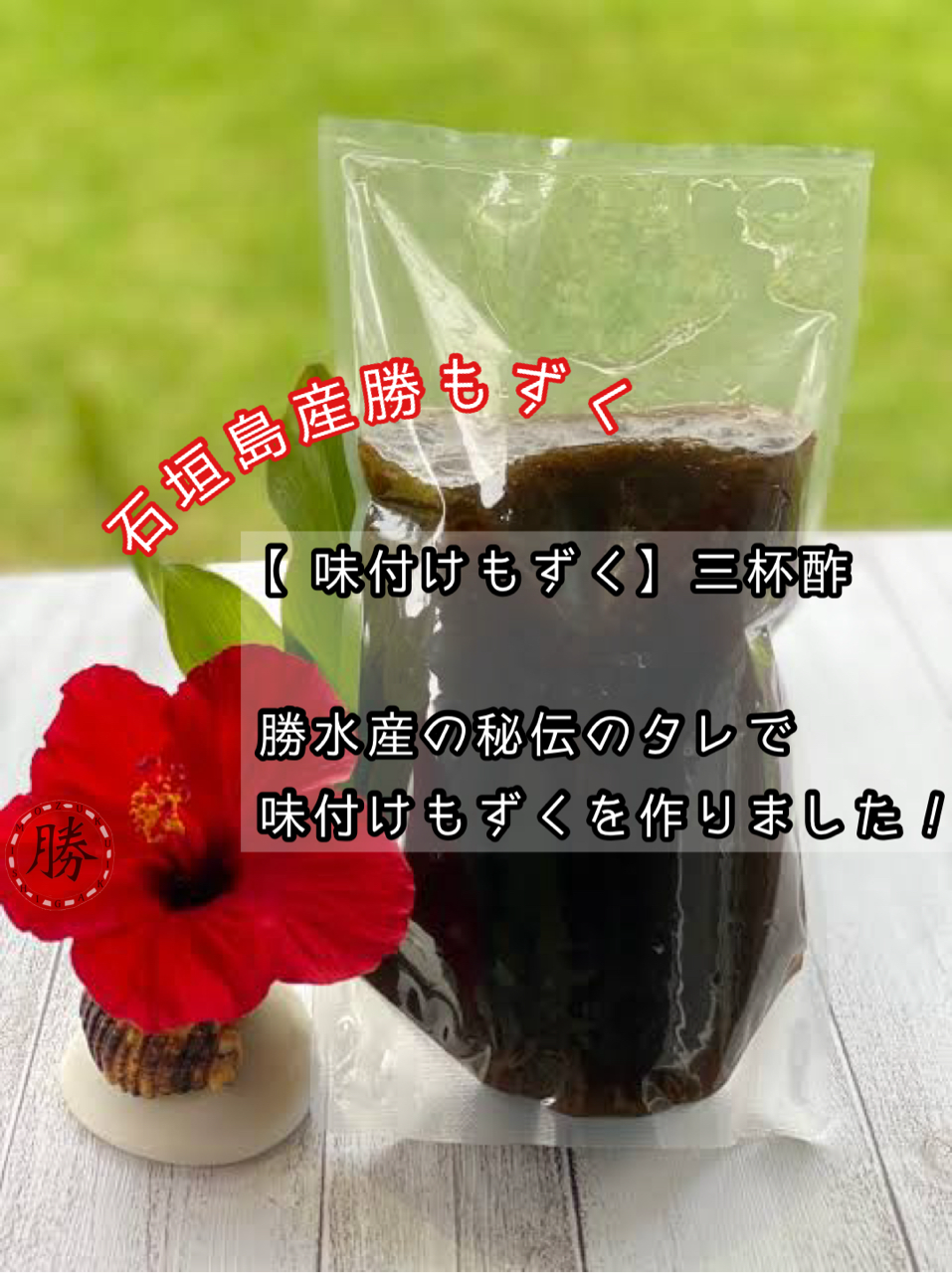 勝水産の自家製特製タレで、もずくの美味しさを引き出した味付けモズクになります。(三杯酢)